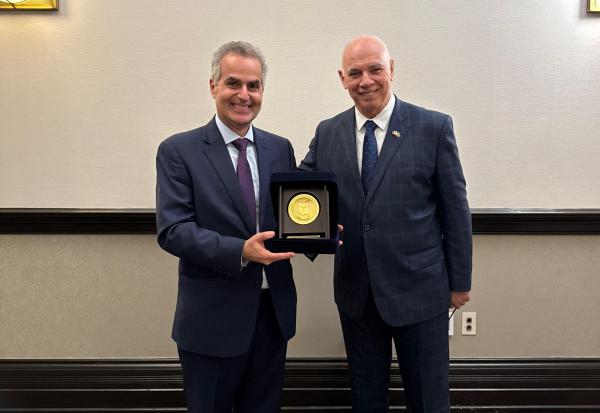 Em seguida, o Tenente-Brigadeiro do Ar Damasceno prestou uma homenagem ao Secretário-Geral da OACI, Juan Carlos Salazar, ao conceder-lhe a Medalha Mérito Santos-Dumont. A cerimônia, que também contou com a presença do Presidente do Conselho da Organização, simbolizou o reconhecimento internacional e o fortalecimento dos laços de cooperação entre Brasil e a OACI.